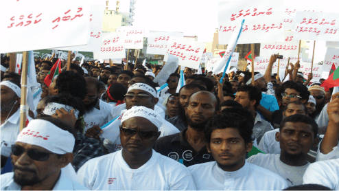 މުޒާހަރާއަށް ވަޑައިގެން ބައެއް ބޭފުޅުން ދިއިސްލާމްއަށް ހާމަކުރެއްވިގޮތުގައި 'މިއަދުގެ ބޮޑު އެއްވުމުން ރައީސް ނަޝީދަށާއި މިސަރުކާރަށް ރަށްތަކުގައި ރާ ވިއްކުމަށް ދިވެހި ރައްޔިތުން ދެކޮޅުކަން އެނގެން ޖެހޭނެ'ކަމަށެވެ.