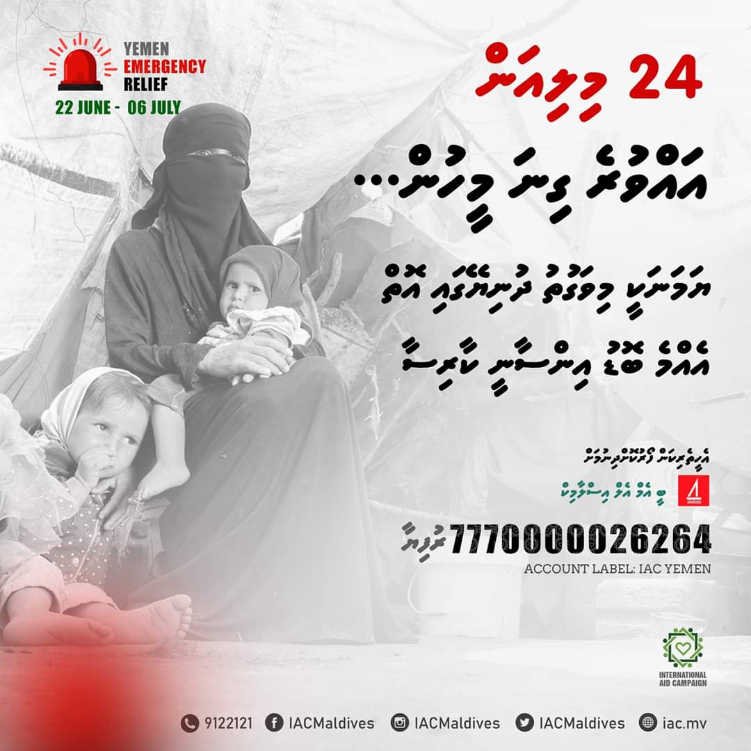 ނިކަމެތިންނަށް އެހީތެރިކަން ފޯރުކޮށްދެވޭނެ ދަނޑިވަޅެއްގެ އިންތިޒާރުގައި ތިބި ދިވެހިރައްޔިތުންނަށް މި ފުރުސަތުގެ ޒަރިއްޔާއިން ޔަމަނުގައި ތިބި އަޙުންނާއި އުޙުތުންނަށް އެހީތެރިކަން ފޯރުކޮށްދެވޭނެކަން އައިއޭސީއިން ހާމަކުރެއެވެ. އެގޮތުން ޔަމަން އެމެޖެންސީ ރިލީފް ފަންޑަށް އެހީތެރިކަން ފޯރުކޮށްދޭން ބޭނުންވާ ފަރާތްތަކަށް އައިއޭސީ ޔަމަން އެކައުންޓް : މެދުވެރިކޮށް ޑޮނޭޝަން ފޮނުވުމުގެ ފުރުސަތު ވަނީ ހުޅުވާލާފައެވެ. މި ކެމްޕޭނާއި ބެހޭ އިތުރު މަޢުލޫމާތެއް ބޭނުންނަމަ އައިއޭސީގެ ހޮޓްލައިން ނަންބަރު 9122121 ގުޅޭނެއެވެ.