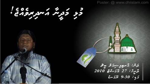 ޢިބްރަތް ޙާޞިލްކުރަމާތޯ؟ ގެ ނަމުގައި ޖަމްޢިއްޔަތުލް މުވައްޙިދީންގެ ފަރާތުން ވަރަށް ޚާއްޞަ ދަރުސްއެއް ބާއްވަނީ ޖަމްޢިއްޔަތުލް މުވައްޙިދީންގެ ފަރާތުން އައްޑޫއަތޮޅަށް އަމާޒުކޮށްގެން ހިންގަމުންގެންދާ ސިލްސިލާ ދަރުސްތަކުގެ ތެރެއިން ދަރުސްއެއް "ޢިބްރަތް ޙާޞިލްކުރަމާތޯ" ގެ ނަމުގައި 06 އޯގަސްޓް 2010 ... އައްޝައިޚް މުޙައްމަދު ޝާފިއު ބިން އަބްދުލްޣަފޫރުއޯގަސްޓް 6, 2010 ރާއްޖޭގެ ޚަބަރު